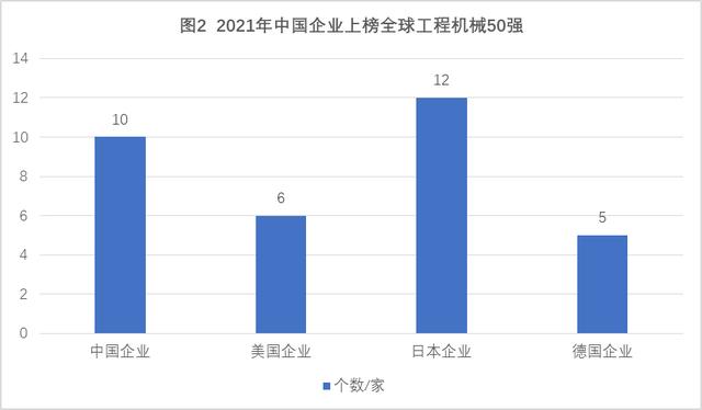 從英國KHL已公布的2012年和2021年全球工程機械50強榜單中,中國企業2012年、2021年上榜變化如圖1、圖2所示,營業收入所占比例如圖3、圖4所示。