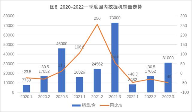 工程機械行業仍處調整周期。同時,作為投資依賴型和周期性行業,工程機械面臨原材料價格上漲、供應鏈緊張、排放升級等諸多不確定因素。時間進入到2022年,春節因素加之原材料價格盡管有所回落,但與去年同期相比依然保持了較高增幅,物流成本上漲,加之截至目前全國28個省份新冠疫情再度襲來,全國各地散發疫情對銷售和基建下游施工均造成了一定程度影響,給本身就處于下行期的我國工程機械行業復蘇又蒙上了一層陰影。從目前協會公布的數據來看,2月份除升降工作平臺同比增長158%外,其他主要工程機械產品均出現不同幅度下降。以挖掘機行業為例,2022年1月份挖掘機共銷售15607臺,同比減少3994臺,下降20.4%。其中國內銷售8278臺,同比減少7741臺,下降48.3%;出口7329臺,同比增加3747臺,增長105%。2022年2月份挖掘機銷售24483臺,同比下降13.5%。其中國內銷售17052臺,同比下降30.5%;出口銷售7431臺,同比增長97.7%。日前,據工程機械雜志社預測,3月份挖掘機銷量40000臺左右,同比下降49%。其中,國內市場預計銷量31000臺,同比下降58%;出口9000臺,同比增長49%。